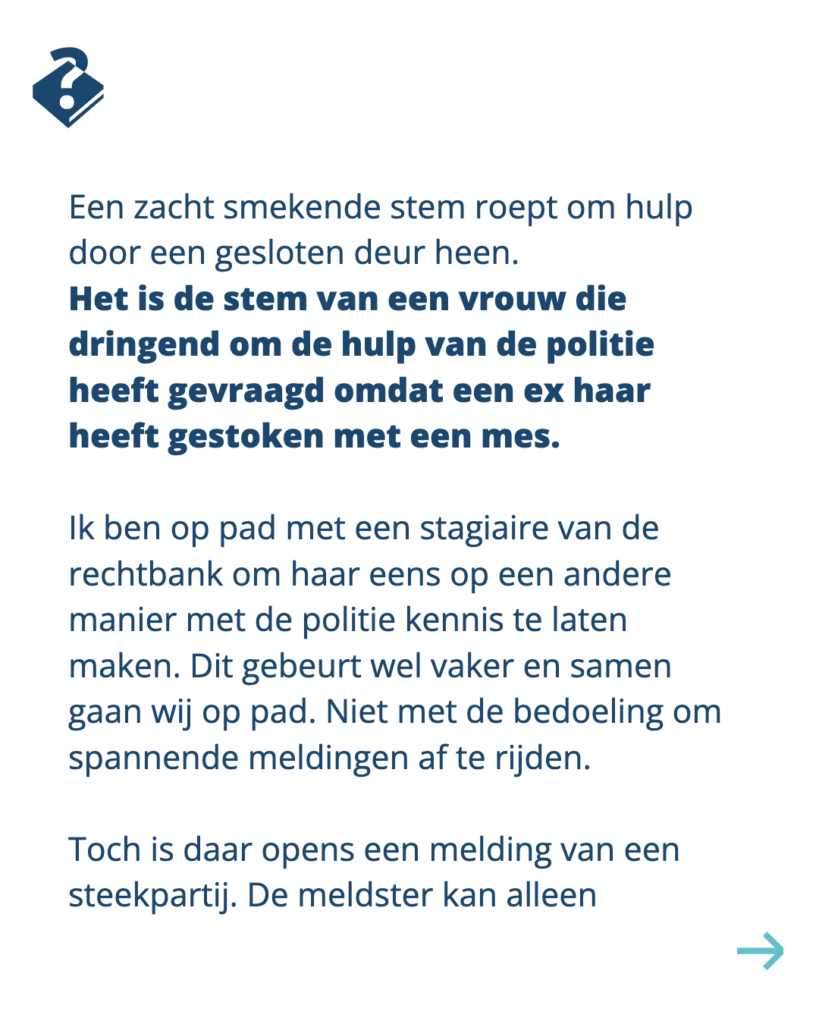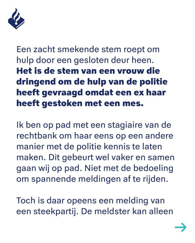 De Instagram posts van de politie hebben na de intro animatie (die ik hierboven heb laten zien) ook nog een aantal pagina’s met tekst. Die zien er als volgt uit en kan je hier uitproberen als Livechart (liefst op een computer).